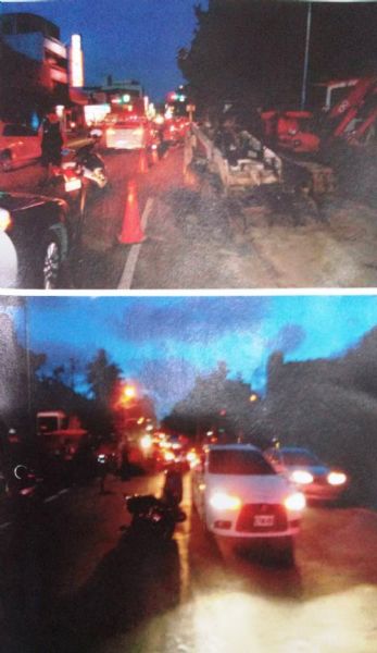 由於該路段車流量很大,埋設自來水管線申請施工只到下午5時,但肇事的昱臣營造直到晚上還在操作,已經違反規定,而劉姓堆高機司機倒車失當,後方機車閃避不及,和其他二輛轎車擦撞,劉某下車面對當事人時還口氣欠佳,讓無端遭殃的車主難以接受。