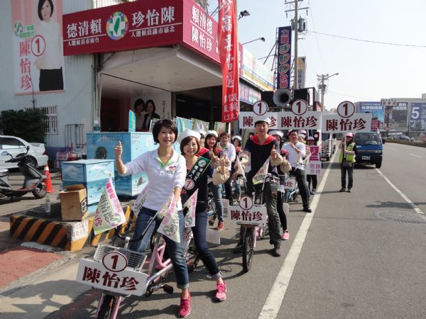 選戰剩下倒數十天,今日為選委會公告直轄市議員競選活動起跑之日。民進黨台南市北區市議員陳怡珍,由擔任立法委員的胞姊陳亭妃及許多支持者陪同,率領大力水手卜派部隊,腳踩著「信任、希望」協力車開跑,要踏遍北區大街小巷,象徵著中央、地方同心協力要為大台南市打拚。