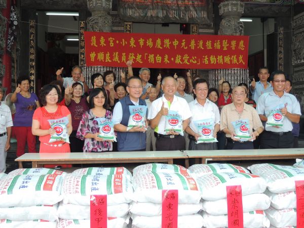 市議員曾順良表示,為慶讚中元及慶祝中秋節,感謝東區護東宮執事及小東市場攤商獻愛心做功德,配合由台南市良友會主辦「府城有愛、良友有情」愛心米捐贈活動,今年特擴大舉辦,贈米給東區後甲國中、崇明國小及東光國小外,今年分贈永康區五王國小,期能照顧弱勢家庭,讓其感受社會各界的溫情。