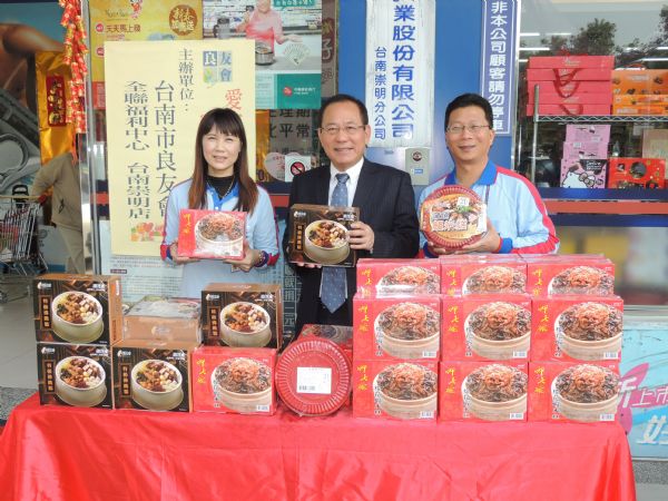 全聯福利中心台南市崇明店為響應台南市良友會「愛在東區」系列活動,台南第二區區經理戴銘儒、崇明店經理曾寶慧與良友會共同募集一百九十份年菜送愛關懷東區弱勢,昨天上午十時在東區崇明路全聯福利中心崇明店舉行捐贈儀式,由市議員曾順良代表接受,曾順良表示,年菜將由良友會配送到獨居老人及弱勢家庭手中,讓他們在春節過年之際,感受到社會的溫暖。