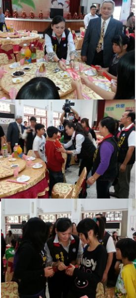 燕祝之友會夥伴今年農曆年收到市議員林燕祝年節加菜金,志工們不思裹腹,有志一同決定轉贈給育幼所,來得更具意義,林燕祝靈機一動拿出總統馬英九送給議員的紅包袋,分裝成42份小紅包,上午同往探視院童,做為安置院生壓歲錢。