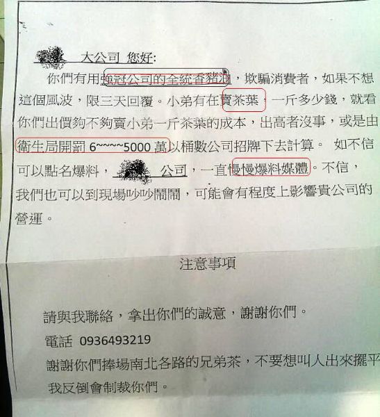 從事食品加工業數十年的永康區民,近日接到匿名信,誣指他使用強黑心油,如果被主管單位查獲得開罰6—5000萬元罰金,需向他們買「兄弟茶」抵數,並在3天內答覆,否則將爆料給媒體,甚至揚言派員到廠房鬧場,擴大事端的結果,勢必衝擊公司正常營運。