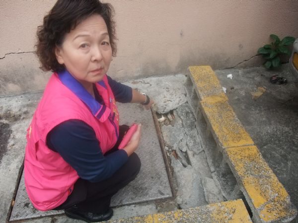 洪玉鳳議員表示,新建的保安市場才改建7年,應該還屬於新建築,但該建物的牆面卻出現大面積的龜裂情況,且水泥牆面的龜裂皆是橫向,裂痕有好幾公分,加上緊鄰牆面的地面也出現塌陷及鋼筋裸露,讓地方相當憂心是否該建物的工程品質出問題。