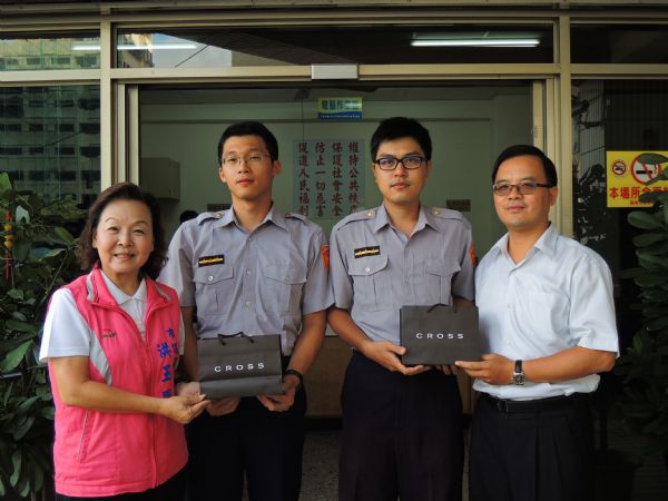 中正派出所開出雙響炮,員警歐存鋒、林祿迪勤務之餘不忘自我進修,參加中央警察大學102學年度學士班二年制技術系考試,高分錄取巡官班,同為警察家庭的市議員洪玉鳳昨特地前往中正所祝賀,贈筆期勉他們用功學習,日後能留在台南服務鄉親。林祿迪:警專24期畢,歐存峰:警專25期畢,二人均在97年間分發到中正所任職。