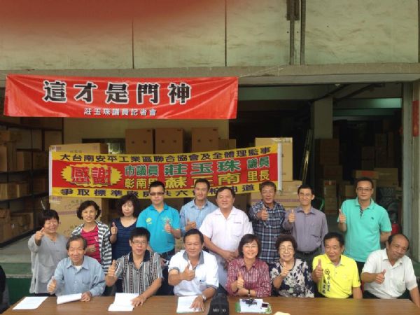 經濟部工業局下設台南市安平工業區中央廠房周邊道路將近20年從未鋪設維護,以致道路品質每況愈下,甚至影響居民行車安全,經市議員莊玉珠四處奔走,終於獲得市長賴清德同意協助,工程業已發包完成,預計今年11月中旬進場,月底完工,莊玉珠表示,這才是門神,看顧地方建設的門神。