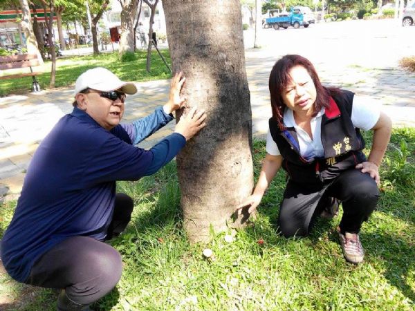 曾培雅市議員、崇明里長李仁慈會同市府工務局,會勘巴克禮紀念公園內多種樹木,因褐根病、靈芝菌造成多株鳳凰木、黃花風鈴木等數種從根腐蝕,導致目前有五棵樹齡超過五年的大樹,即將面臨死亡。