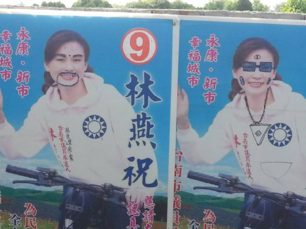 選戰日趨白熱化,候選人廣告文宣互比苗頭之餘,卻也淪為「攻擊」目標,市議員林燕祝在永康、新市區旗幟看板屢被破壞,遭人亂塗鴉、割裂,疲於更新,令工作人員之氣結。