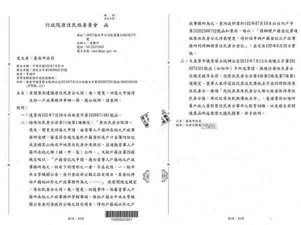 行政院原民會表示,根據原住民族身份法第4條的規定,原住民族人本來依法就可以直接改成原住民傳統姓名,並且同時取得原住民身份,根本不需要「改從具原住民身份之母之姓並取得原住民身份後,再改成原住民傳統名字」,認為這是戶政單位經辦人員的訓練與認知不足的誤會,各縣市政府應該要多加宣導。而回復原住民身份是否需回到原戶籍地才能辦理的問題,原民會也表示在蔡議員反應後,已經由內政部發文確認,日後「因辦理戶籍登記事項致原住民身份之得喪變更,得於該申辦戶籍登記之戶政事務所同時辦理原住民身份登記」,也就是可以在任何一個戶政事務所來申辦,預計將在今年9月30日開始實施。