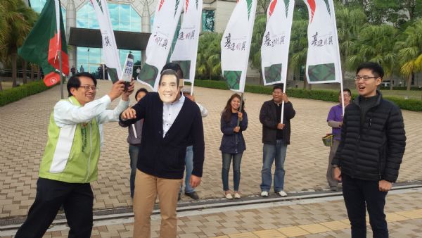基進側翼成員也在台南地檢署門前上演行動劇,顏銘緯向著戴馬英九面具的人嗆聲說「國民黨馬英九不倒,台灣不會好」,之後大家一起丟書砸馬英九替身,蔡旺詮議員也以「被出賣的台灣」一書砸向馬英九替身,象徵支持顏銘緯的丟書動作。