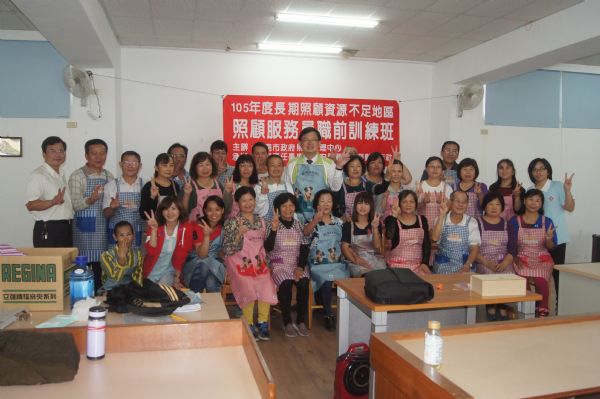 市議員李退之關心溪北區照顧服務員人力不足,向市府社會局爭取「105年度長期照顧資源不足地區照顧服務員職前訓練班」學科結訓,即將展開居家照顧實習,9日李退之為每位學員披上工作圍裙,期許學員們未來職場工作能以疼惜之心為長輩們服務。