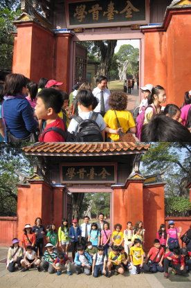 美國學校師生一行七日上午在南門路「全台首學」台南孔廟大門前合影後,王定宇為他們作中英文導覽說,鄭成功趕走荷蘭人收復台灣,但由其子鄭經經營台灣的政策,大多是陳永華策畫主導,對建設台灣貢獻十分重大,台灣首座孔廟─台南孔廟就是他興建的,因此想認識台灣、認識台南,絕對應該知道陳永華這位人物。