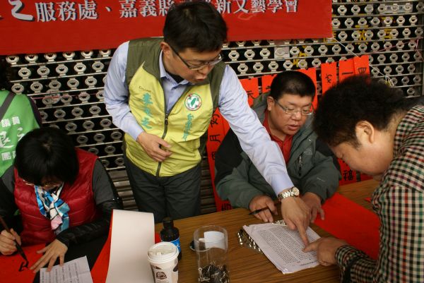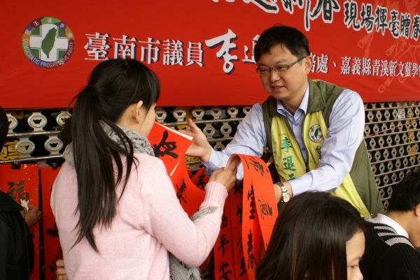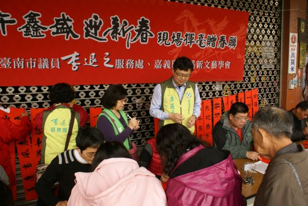市議員李退之本日(1/26)上午於新營區第一市場,與嘉義縣青溪新文藝學會合辦「甲午鑫盛迎新春,現場揮毫贈春聯」活動,邀請吳清華、闕菊懳、陳志明、蔡碧雲、張伊佐、張妃妙等六位書法家現場揮毫、書寫150份春聯送給逛菜市場的鄉親朋友。市議員李退之也到菜市場裡,沿街發送今年製作的甲午鑫盛春聯,與鄉親朋友一起迎新春。