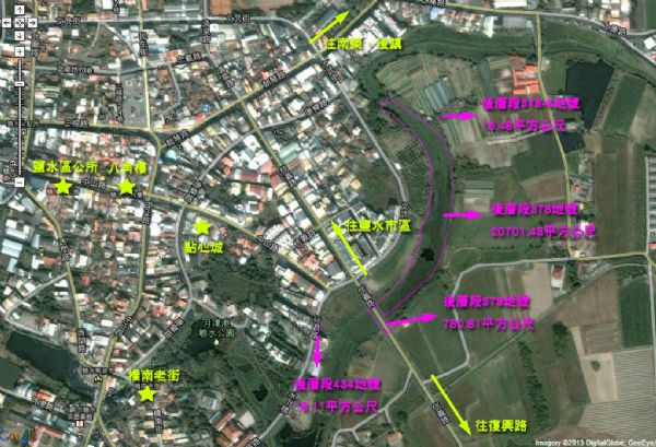 陳清一先生說明,自己早年從事虱目魚養殖,與家族6人自民國60年,共同向國有財產署承租鹽水區後厝段378-6(15.46m2)、378(20701.43m2)、379(780.81m2)、434(15.11m2)地號土地(位置圖詳見附註2),四筆土地地目皆為「養」,而民國82年後,379地號與434地號各自被鹽水鎮公所開闢為信義路、行昌路,但10多年來,從鎮公所、縣政府到現在區公所、市政府皆未向國有財產署辦理撥用,完全無法使用這些土地從事漁業養殖、貼補生計,卻仍無法解除租約,多繳了將近20年租金,兩頭都損失。幸得市議員李退之替其奔走,補償問題終於獲得解決。