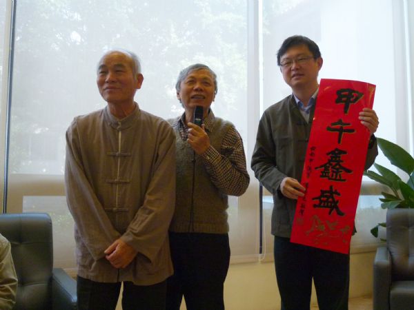 臺南市美術學會周博尚理事長則肯定李退之議員對於大新營地區在地藝文發展的支持,為呼應「甲午鑫盛」的概念,周博尚理事長也以「甲第雲連神駿到,午窓風暖畫屏開」的對聯向大家拜早年。