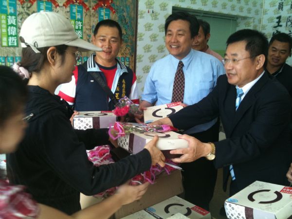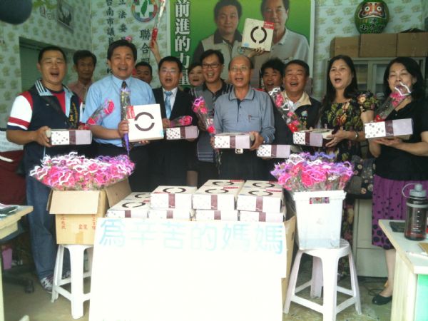 立委陳唐山、市議員王定宇希望所有辛苦的媽媽都快樂,並於9日起一連三天,在永康聯合服務處,特別辦理「為辛苦的媽媽加油」活動,致送永康區所有低收入戶蛋糕、康乃馨。