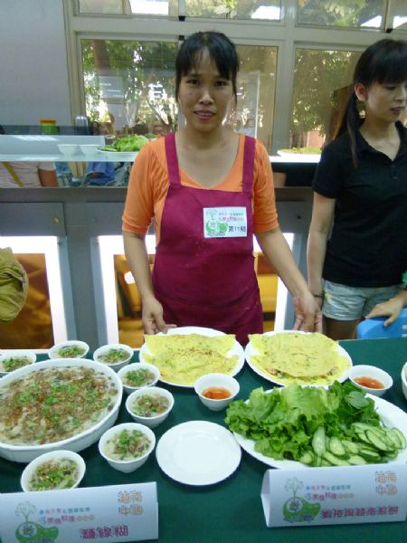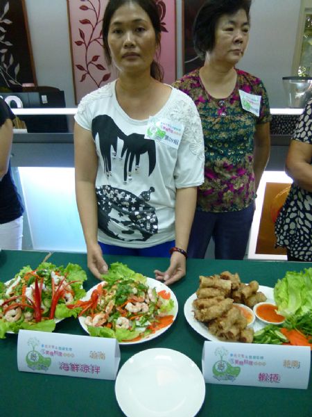 為提高新住民們參與臺灣社會活動、促進多元文化交流,臺南市議員李退之、社團法人臺灣大台南發展促進會,以及鹽水國小與本日(10/12)共同舉辦「多元文化&低碳在地」美食料理邀請賽,邀請了12組新移民參賽者來到南榮科技大學參賽,調理出的各道美味異國料理令到場讚聲的賴美惠議長驚艷不已,當下自請加入明年賽事的舉辦,要讓這項文化交流更盛大。而比賽結果則由來自越南、住在鹽水區水秀里的阮嬌鸞以海鮮涼拌及改良式蝦捲獲得冠軍。