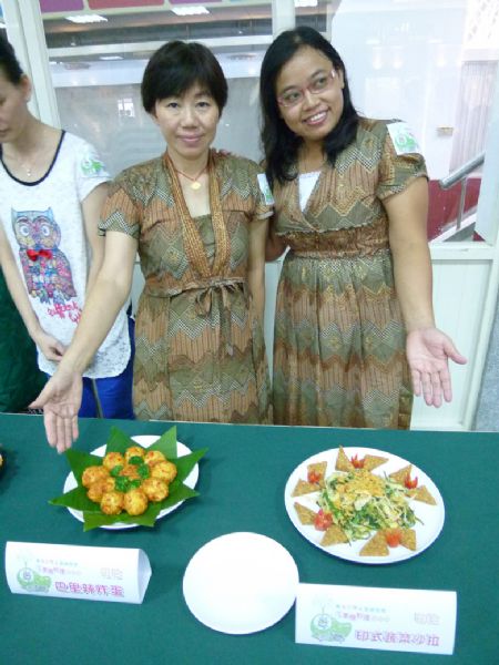 蘇依英,來自印尼,目前在臺南市區的移民署擔任通譯人員。蘇依英說「巴里辣炸蛋」是巴里島的特色菜,同時因為「吃當地」、「吃當季」、「簡易烹飪法」等低碳飲食主題,所以另一道菜選擇製作「印式蔬菜沙拉」,與一般的生菜沙拉最大不同有兩點,除了蔬菜必須先川燙,另外則是使用椰子粉與香料一起炒過調製的沙拉醬,不使用美乃滋。