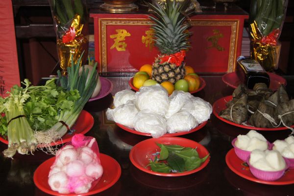 今年除祈福卡外,在祭祀祈福儀式上遵循祭拜文昌該有的禮俗,準備了包括鳳梨(旺來)、蔥(聰明)、蘿蔔(好彩頭)、蒜(會算)、包子和粽子(包中)、芹菜(勤勞)、油(加油)、發糕(考運發)等貢品,同時一起祭拜的各校代表身上還帶著桂花葉,希望考生臨危不亂、考運亨通。