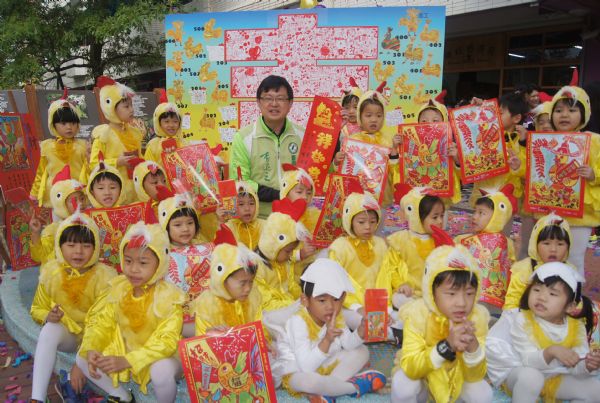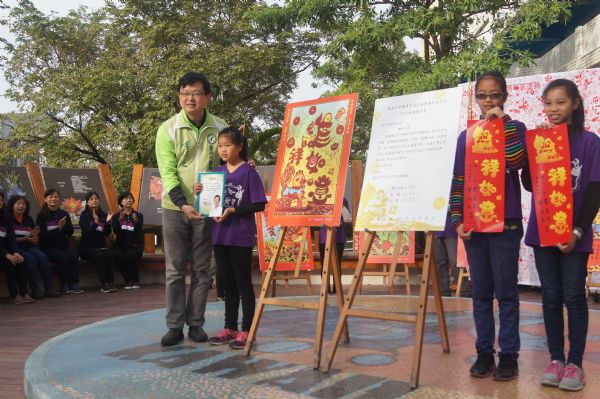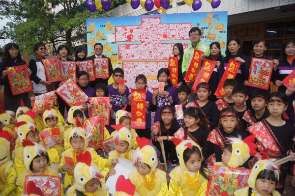 李退之表示,往年服務處農曆年應景春聯設計,多邀請書法家代筆且廣受好評,今年為支持兒童美術創作,決定改變春聯的印製方式,和新進國小的美術班合作,以小朋友設計的年晝美術作品,作為春聯的設計主軸,希望藉由小朋友晝作中純真的祝福,來迎接2017(106)吉(雞)年的到來。