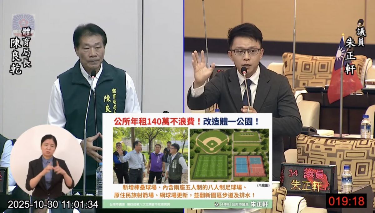 台南市議員朱正軒今日於議會質詢中指出,經過多次會勘,已成功爭取體一運動公園的設施改善與規劃經費,未來可望新增棒壘球場、兩座五人制可合併為八人制的足球場、原住民族射箭場,同時進行網球場更新、園區步道及排水翻修等工程,期望打造兼具多元與安全的運動環境。