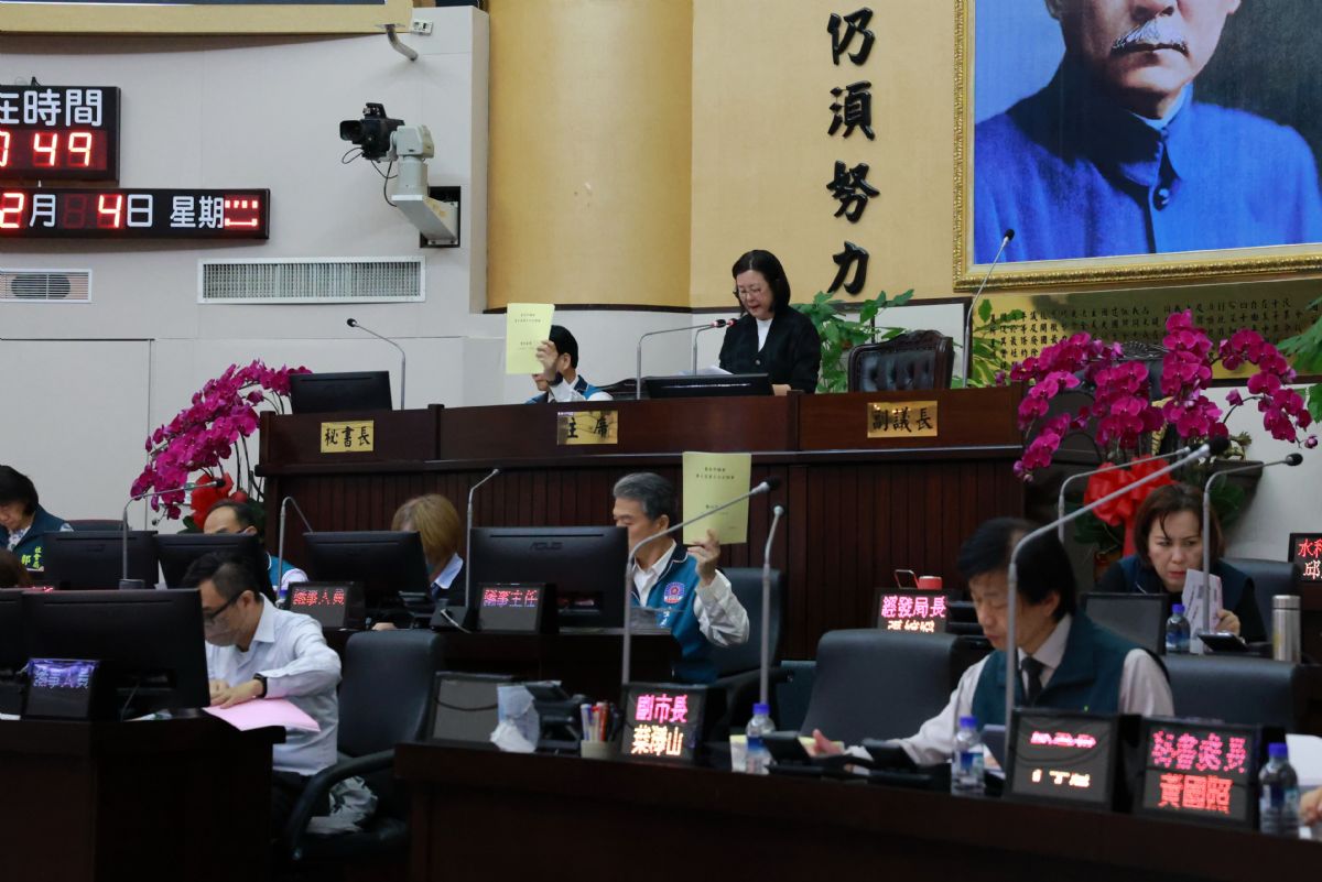 4日大會進行審議各項提案、三讀議案第二、三讀會、臨時動議等議程,黃偉哲市長因出國參訪並行銷本市農特產品向大會請假,由葉澤山副市長代理率市府局處首長列席。