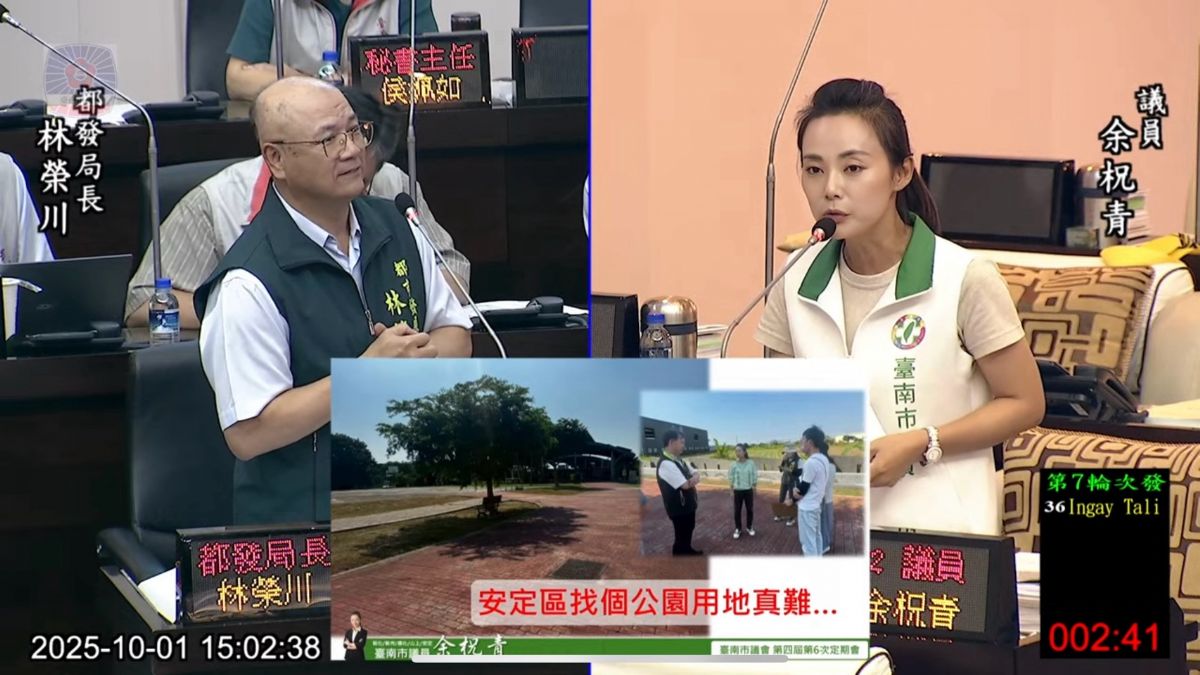另外,余柷青議員也關心安定區的發展。她表示,自縣市合併後,除南科土地重劃有明顯進展,其餘生活圈幾乎沒有政策推動,因此她積極尋找適合安定的「特色主題公園」。然而,因土地使用地目之限制,會勘過程屢屢受阻。經評估後,最理想腹地位於安定的複合式運動公園,但現為殯葬用地。余柷青與都發局積極溝通下,後續將建請安定區公所擬定興辦事業計畫,並送地政局辦理非都市土地變更(2公頃以下),將殯葬用地轉為特定目的事業用地,讓安定特色公園有望成真,另在南科特定區D區未來也預計規劃公園用地可打造特色公園,落實市府一區一特色公園的政策執行。