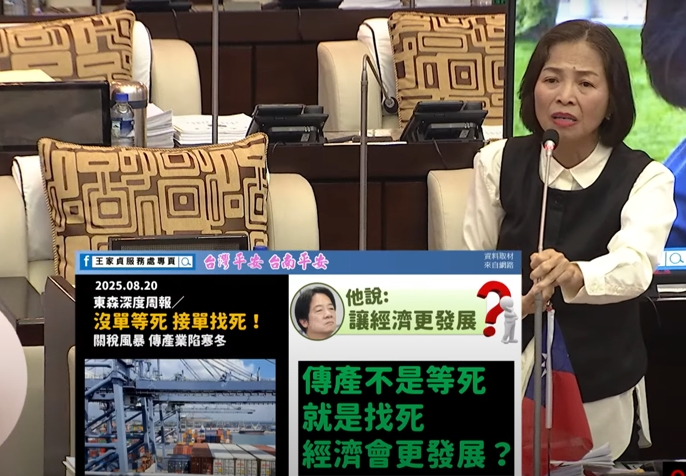 王家貞要民進黨告訴台南人,因為台南是傳統產業重鎮,業者面對土地貴、人工貴,台幣升值,美國關稅懸在空中,紛紛想出走,經濟因為賴清德總統的作為不安全,台灣人很辛苦。