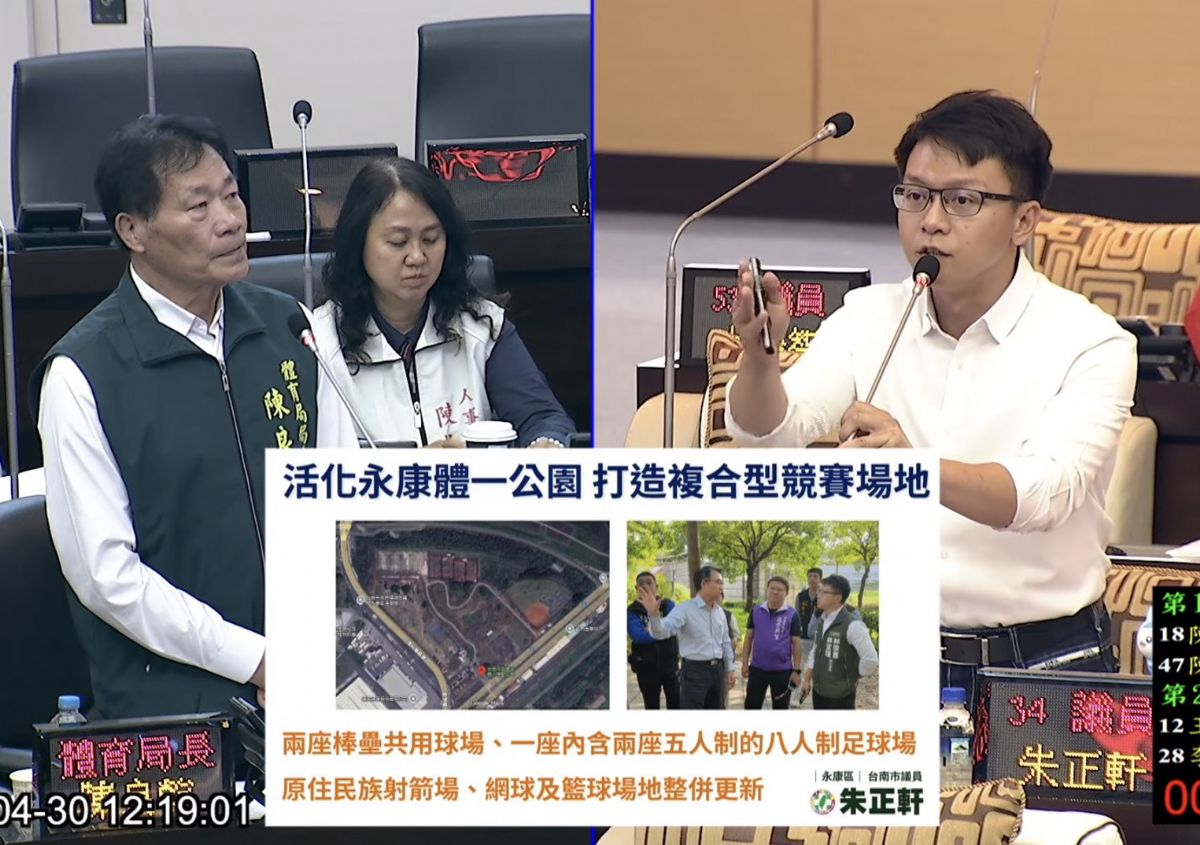 針對體一運動公園,朱正軒表示,該處為永康北側少數運動空間之一,但目前使用率偏低,實屬可惜,建議透過重新規劃兩座棒壘共用球場、一座內含兩座五人制的八人制足球場原住民族射箭場、網球及籃球場地整併更新,提升場域吸引力、導入運動人流,期盼體育局積極推動相關改善方案。